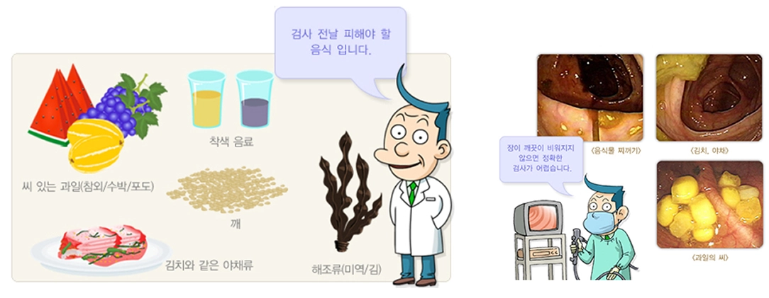 대장 내부가 깨끗해야 정확한 검사를 편하게 받을 수 있습니다. 장정결이 잘 되지 않으면 용종이나 암 등의 대장 질환이 간과 될 수 있습니다 과거에는 아주 많은 양의 장정결제를 복용해야하는 불편감 때문에 검사를 거부하는 경우도 있었습니다만 현재는 복용량을 줄이고 맛을 개선하여 환자 편의를 증대시킨 장정결제가 사용되고 있으므로 걱정하지 않으셔도 됩니다 검사 3-5일전부터 섭취를 피해야할 음식들이 잇으므로 의료진의 안내를 받으시면 됩니다.