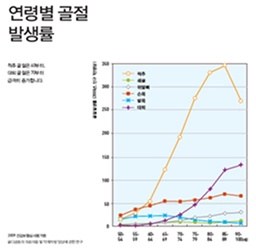 골다공증은 골절이 발생하기 전까지 특별한 증상이 없으므로 잘 모르고 지내는 경우가 많습니다. 골다공증의 주증상은 골절이며 나이가 많아질수록 골절이 많이 발생합니다. 특히 척추 골절이 가장 흔하게 발생되며, 약 50%에서 아무런 증상 없이 발생됩니다. 특히 골절이 발생되고 나면 재골절의 위험도는 크게 증가합니다. 또한 골절에 의해 사망률도 높아지기 때문에 골다공증성 골절의 발생을 예방하는 치료가 중요하고 또한 골절이 발생된 이후에는 재골절의 위험을 낮추기 위하여 더욱 더 적극적인 골다공증 치료가 요구됩니다.