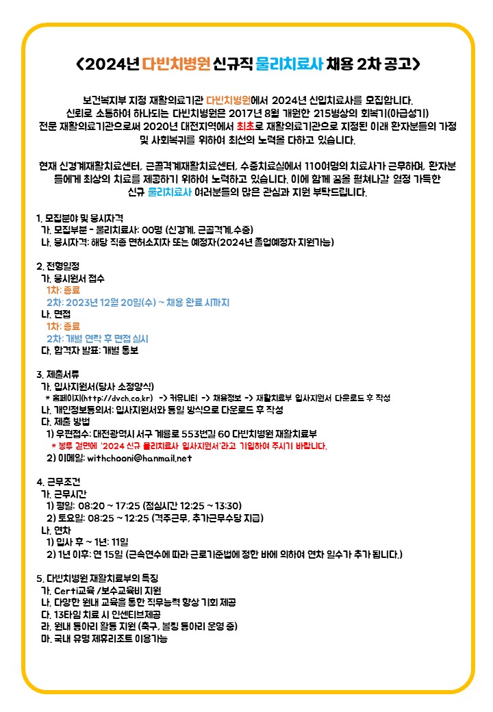 2024년 재활치료부 신규 공개채용 2차(물리치료사) 안내