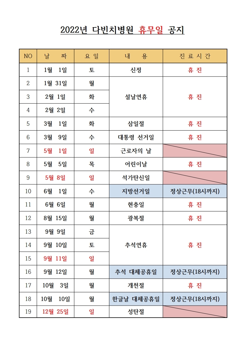다빈치병원 2022년 휴무일 안내 입니다.