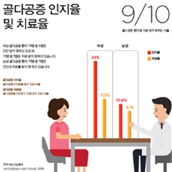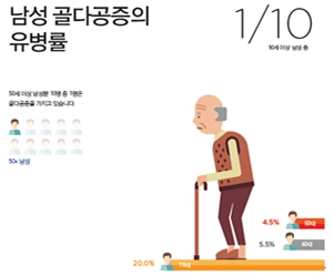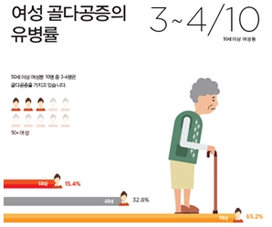 국내 연구에서 60세 초반의 여성의 경우 약 50%, 60세 후반의 경우 약 70%에서 골다공증이 있다고 보고되고 있으며, 평균 수명이 증가하면서 그 유병율은 매우 가빠르게 증가되고 있습니다. 골다공증성 대퇴골 골절의 경우 그 빈도가 10년 전에 비하여 약 4배 이상 증가하였고 척추 골절의 경우도 우리나라 여성 인구 10만명당 연간 1300여명이 발생하여 대퇴골 골절보다 약 7배 이상 많이 발생된다고 알려져 있습니다.