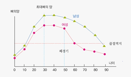 뼈는 일생동안 지속적으로 변화하게 되며, 최대로 양이 많은 시기는 20-30세 경입니다. 뼈의 양은 70%정도는 유전적으로 결정되며 30%정도에서 환경적 요인에 의해 결정됩니다. 일반적으로 남성은 여성에 비해 뼈의 양이 많습니다. 연령이 증가함에 따라 뼈의 양이 감소하게 되는데 특히 여성의 경우 폐경기 이후 첫 5년 동안 뼈의 소실이 가장 많습니다.